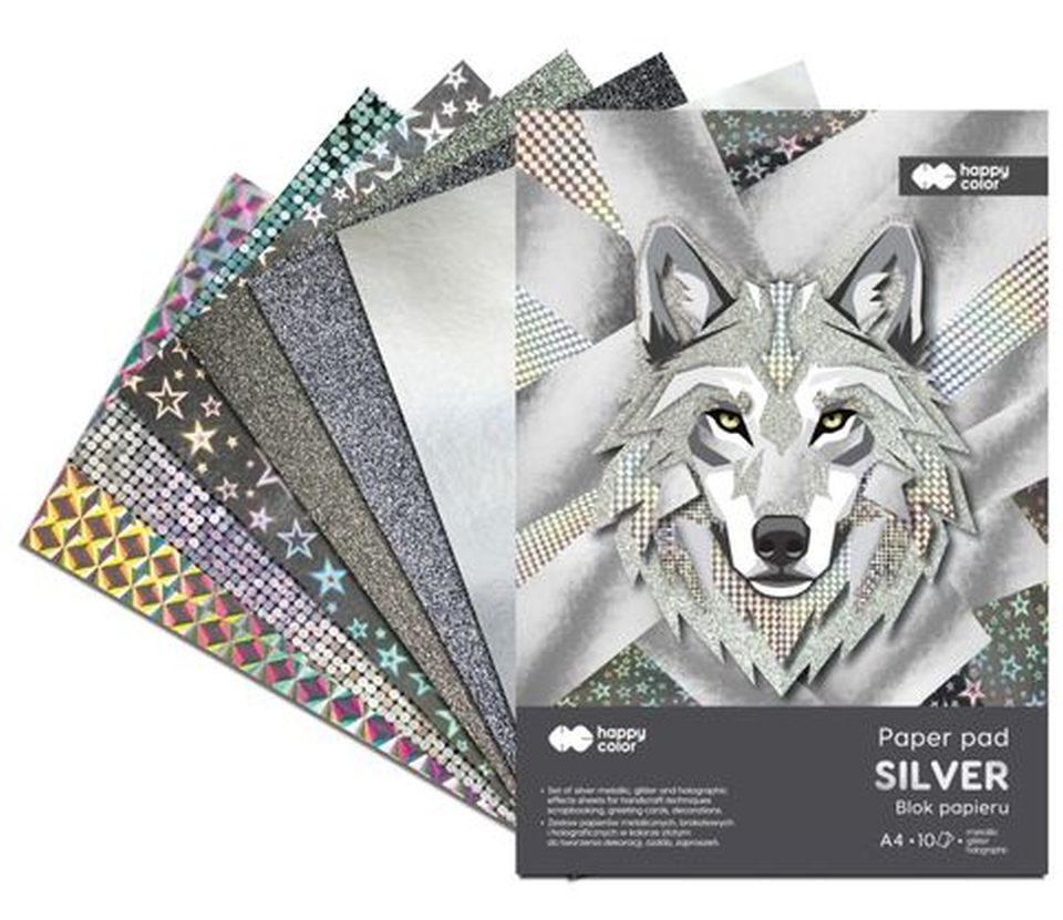 Blok Silver A4 Happy Color służy do tworzenia dekoracji w tonacji koloru srebrnego. Wszystkie kartki są inne, ale utrzymane w konwencji dzięki czemu można je łączyć tworząc niezapomniane prace. Polecane dla wszystkich kreatywnych i posiadających chęć tworzenia dla których ma znaczenie końcowy efekt wizualny