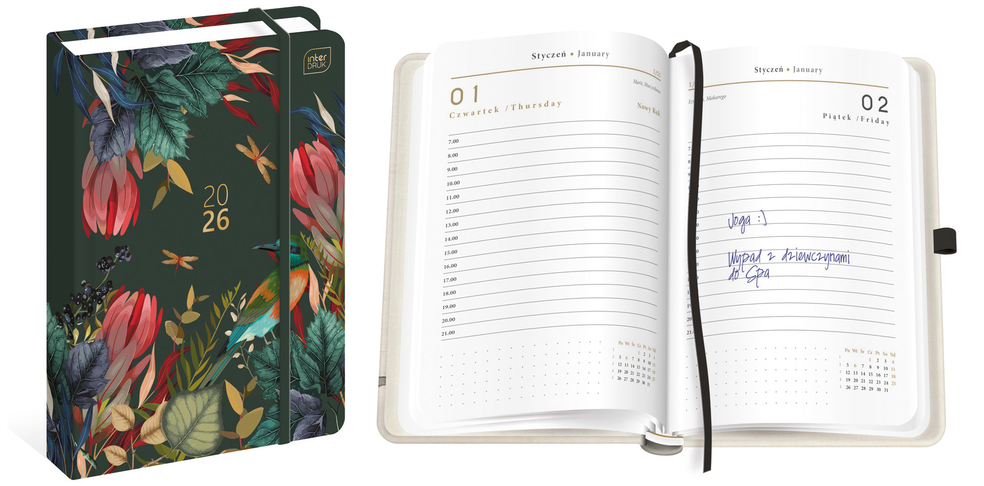 • wyposażony w praktyczne dodatki: tasiemkę do zaznaczania strony i pętelkę na długopis.