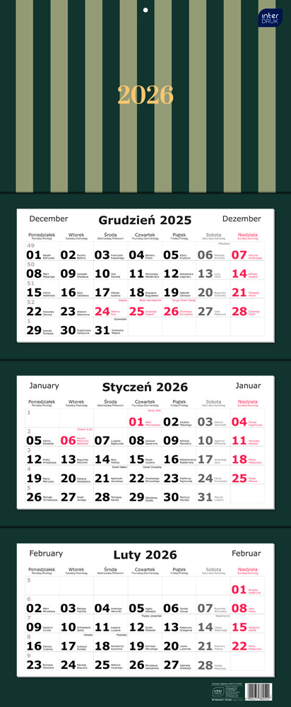 Kalendarz trójdzielny 82,5X34cm Paski 2026 Interdruk