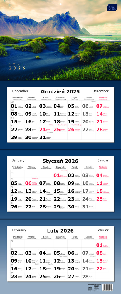 • Kalendarz trójdzielny o wymiarach 34x82,5 cm.