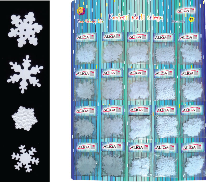 • Rodzaj produktu: Konfetti dekoracyjne w kształcie płatków śniegu w 4 różnych wzorach