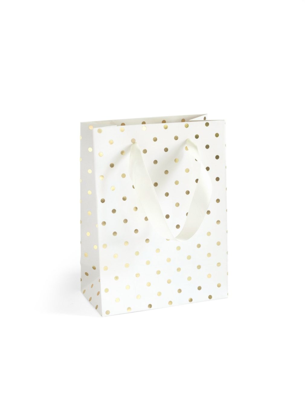 Strona główna » Pakowanie i wysyłanie » Papier pakowy, torebki » Torba papierowa Biała 5 sztuk Złote Kropki 20x8x15cm