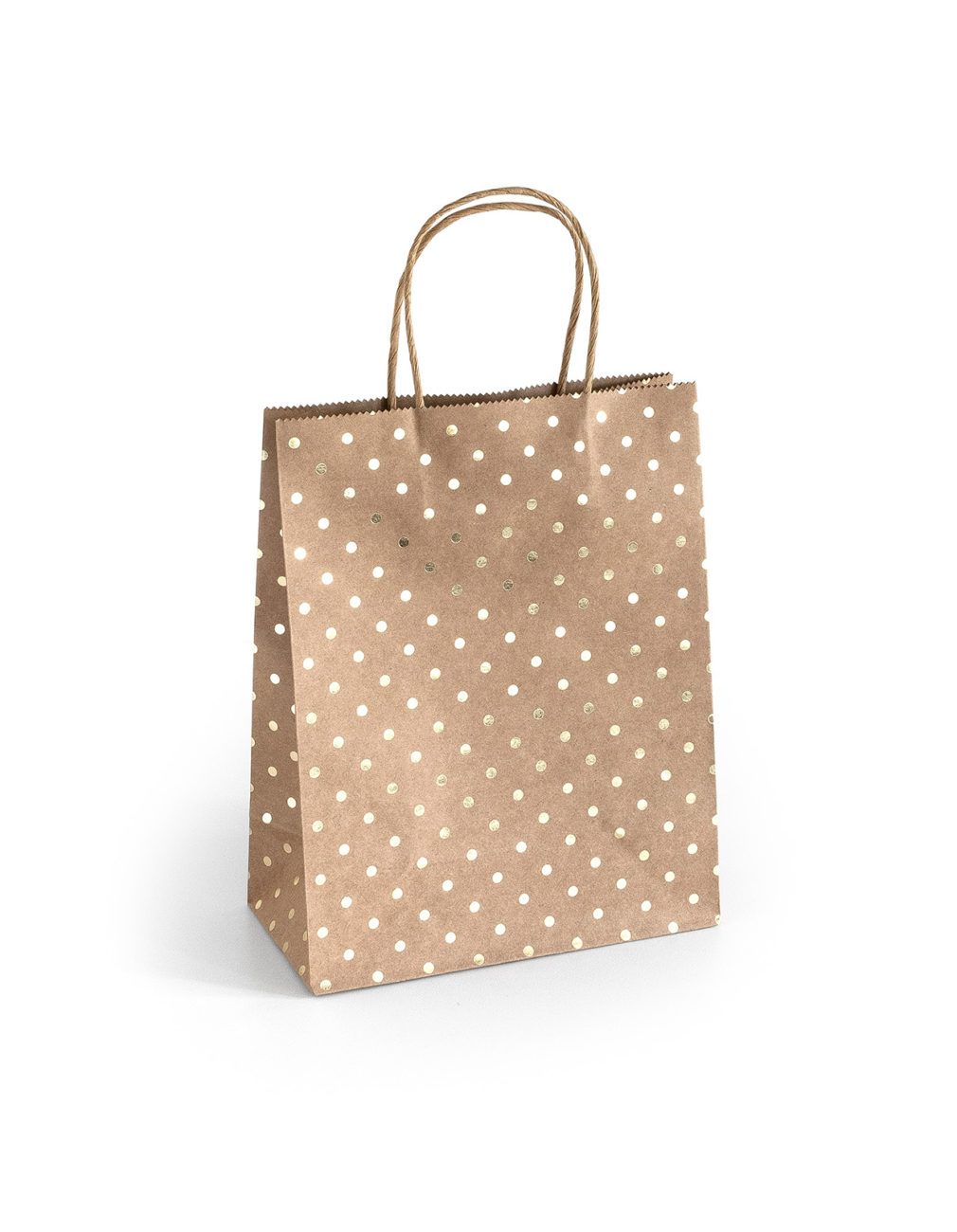 Strona główna » Pakowanie i wysyłanie » Papier pakowy, torebki » Torba papierowa kraft eko 5 sztuk Złote Kropki 25x10x20cm