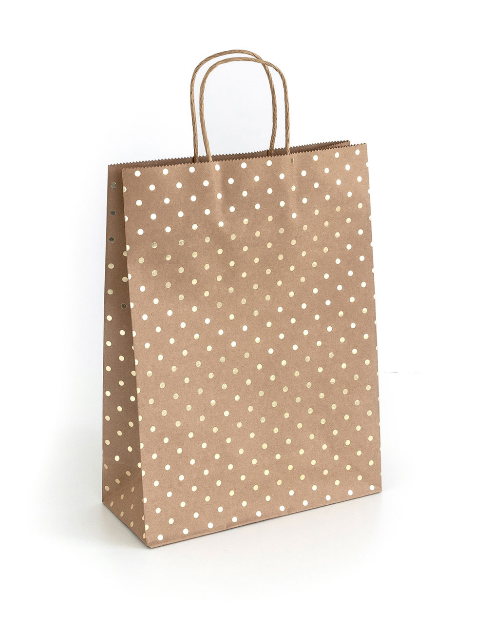 Strona główna » Pakowanie i wysyłanie » Papier pakowy, torebki » Torba papierowa kraft eko 5 sztuk Złote Kropki 33x10x24cm