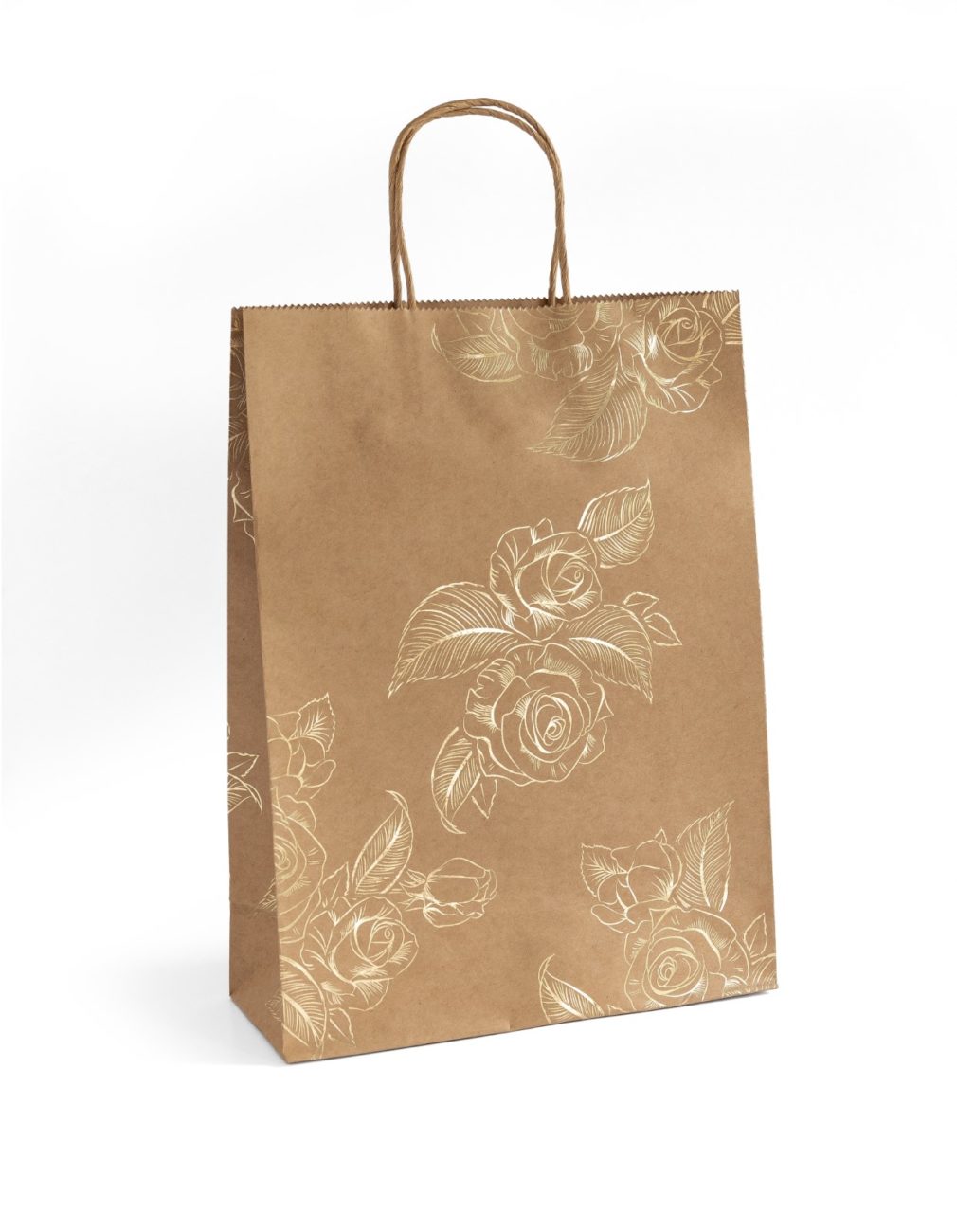 Strona główna » Pakowanie i wysyłanie » Papier pakowy, torebki » Torba papierowa kraft eko 5 sztuk Złote Kwiaty 33x10x24cm