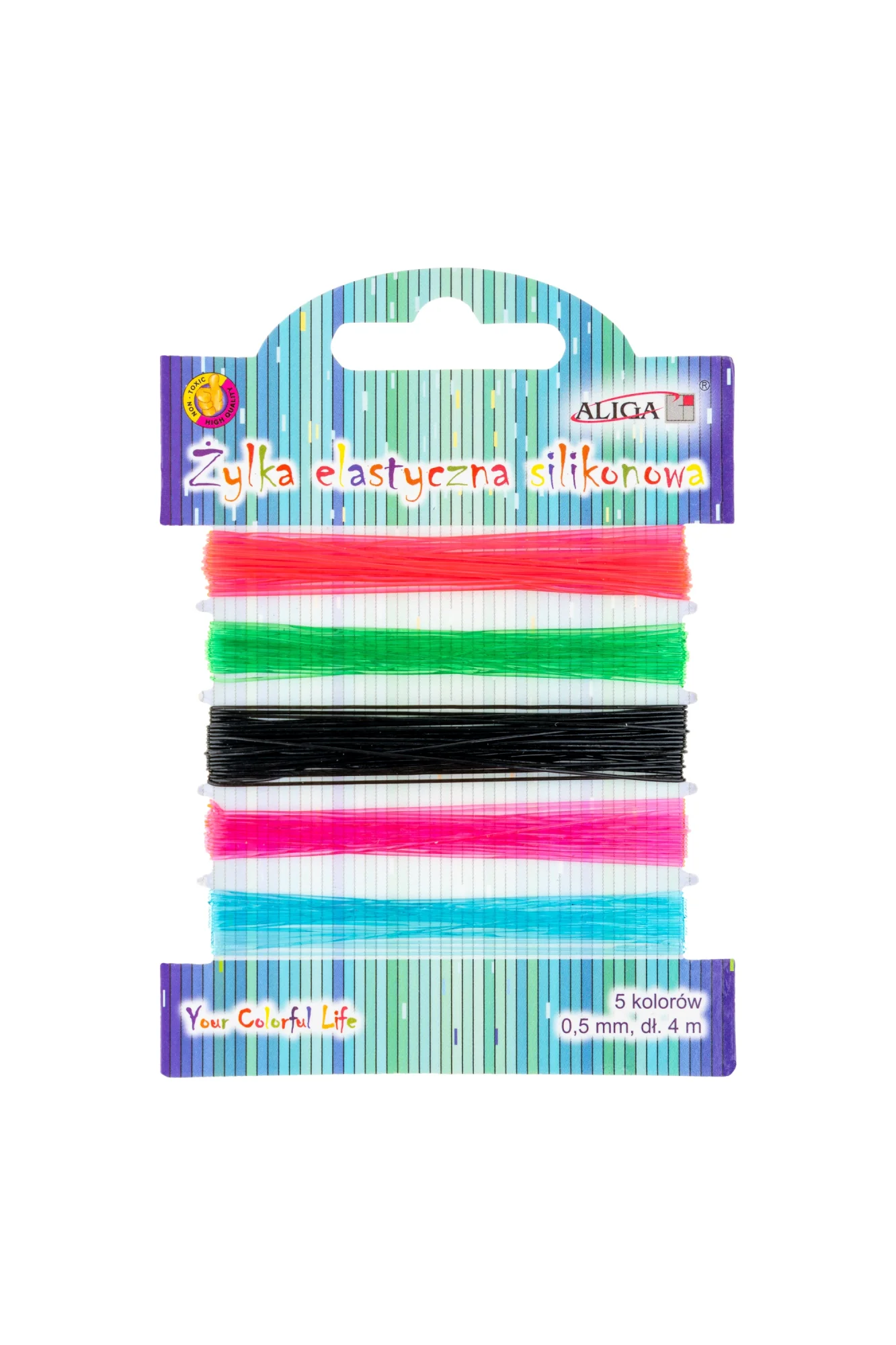 Strona główna » Przybory szkolne » Artykuły kreatywne » Sznurki, wstążki, rafia » Żyłka Elastyczna silikonowa 0,5mm 4m 5 kolorów DA-7406